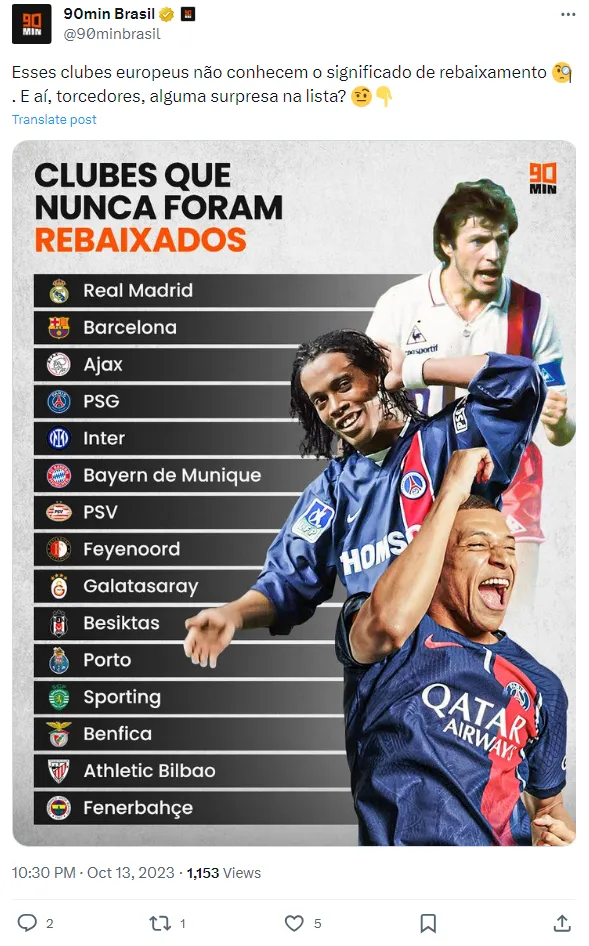 Com isso, temos o Real Madrid, um dos clubes mais icônicos do futebol mundial, nunca foi rebaixado da La Liga, a principal liga de futebol da Espanha, desde a sua fundação em 1902.