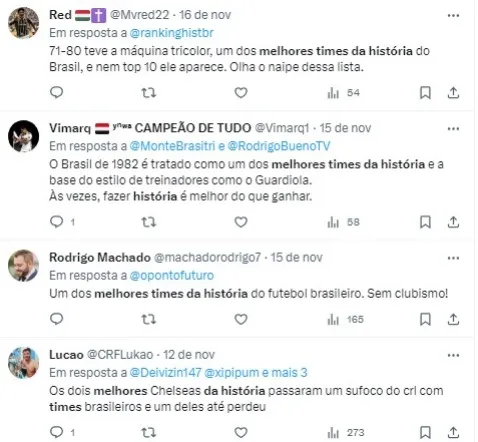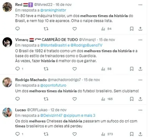 Duas versões da Seleção Brasileira foram destacadas. O time de 1982, considerado a melhor em qualidade técnica, ocupou a 38ª posição. Enquanto isso, a equipe de 1970, que conquistou o tricampeonato mundial, ficou em segundo lugar.