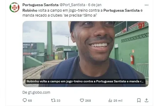 “Sempre me cuidando. Se precisar estamos aí. Meu objetivo é cuidar da família, e graças a Deus as coisas têm caminhado bem, então não estou pensando muito no futebol não”, afirmou Robinho ao radialista Walter Dias, após o treino na Portuguesa Santista.
