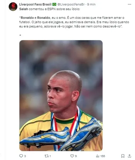 Mesmo sendo uma estrela consagrada no Liverpool, conquistando títulos importantes nos últimos anos, Salah não escondeu sua admiração por Ronaldo Fenômeno.
