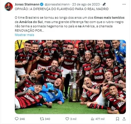 Ele destacou equipes como o River Plate, Atlético-MG e Flamengo como as principais forças do continente, enquanto “esqueceu” de mencionar o Palmeiras.
