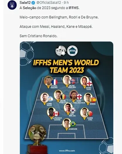 O Manchester City, campeão da Liga dos Campeões e do Mundial de Clubes, dominou as escolhas da IFFHS em 2023 com Ederson, Ruben Dias e Haaland também figuram na lista, destacando o sucesso do clube inglês. O setor ofensivo da seleção conta ainda com Kylian Mbappé e o experiente Harry Kane, artilheiro do Bayern de Munique.