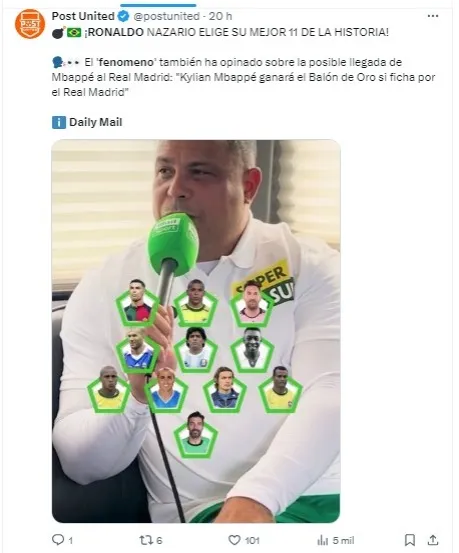Ronaldo, um dos maiores ícones do futebol mundial, participou de um desafio promovido pelo jornal Daily Mail, onde teve a oportunidade de montar sua seleção dos sonhos, reunindo craques de diversas gerações.