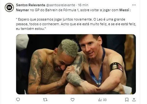No entanto, Neymar não descarta a possibilidade de um novo capítulo ao lado de Messi em campo. Durante sua presença no GP do Bahrein de Fórmula 1, o craque brasileiro enfatizou a excelente relação com o argentino e expressou sua esperança em jogar novamente ao seu lado.