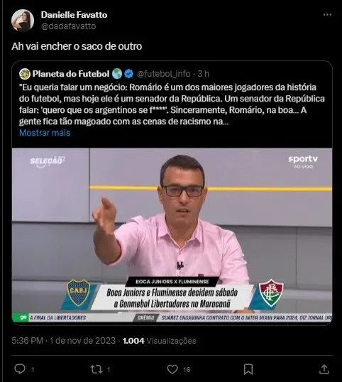 O apresentador André Rizek defendeu um tratamento melhor do veterano pela posição que tem hoje: “Eu queria falar um negócio: Romário é um dos maiores jogadores da história do futebol, mas hoje ele é um senador da República. Um senador da República falar: ‘quero que os argentinos se f****’. Sinceramente, Romário, na boa”, disse o comunicador para o Romário versão senador.