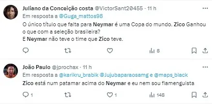 A alfinetada veio ao mencionar que, diferentemente de Neymar, Zico optou por jogar na Udinese após sua passagem pelo Rubro-Negro: “O Zico, para a história do Flamengo, ele é gigante. Mas ele não consegue entregar para a seleção esse gigantismo do Flamengo (…) O Neymar saiu do Brasil para jogar no Barcelona. O Zico saiu do Brasil para jogar na Udinese.”, lembrou.