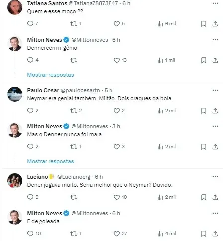 Um seguidor respondeu, destacando a genialidade de Neymar, mas Milton Neves reforçou sua opinião, enfatizando que Dener nunca foi uma personalidade problemática.