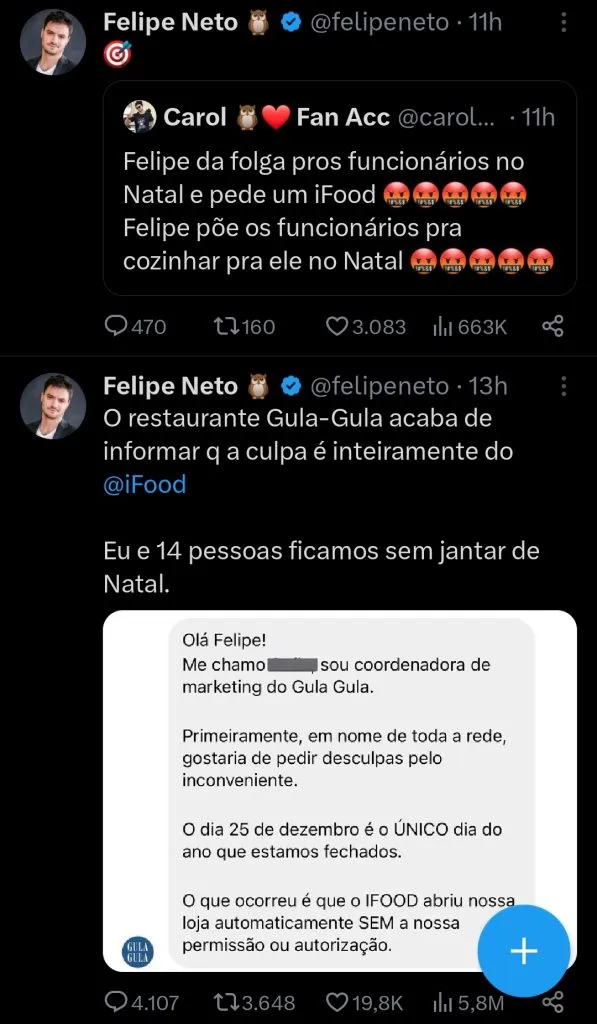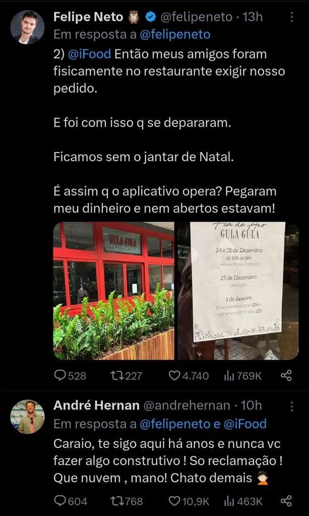 “Oi. Quero saber se é assim que vocês trabalham. Fiz o pedido 19h27. Foi informado que levaria 100 minutos. Ok, é Natal, tudo bem”, iniciou o influenciador, às 21h49 da noite de Natal (25).