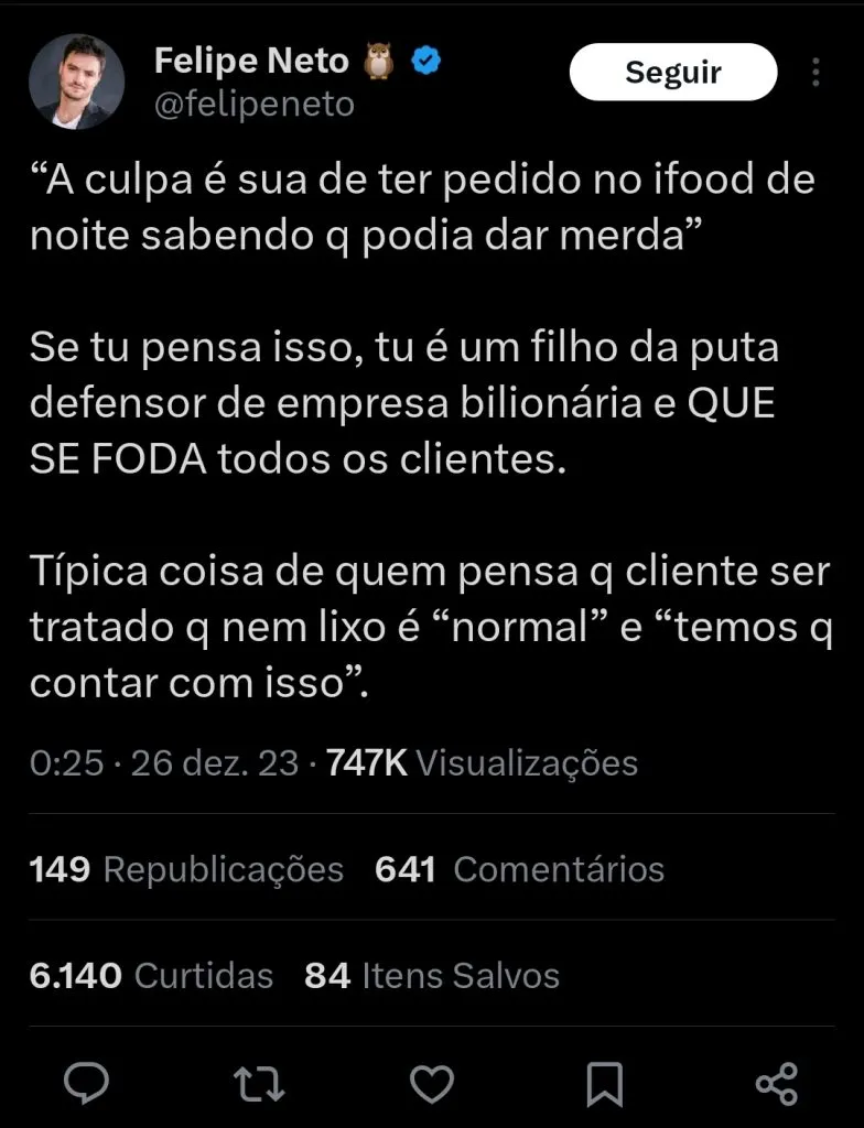 Felipe Neto reclamou de um restaurante em um aplicativo de delivery, totalmente insatisfeito com o atendimento recebido e o feedback zero em relação ao problema enfrentado.