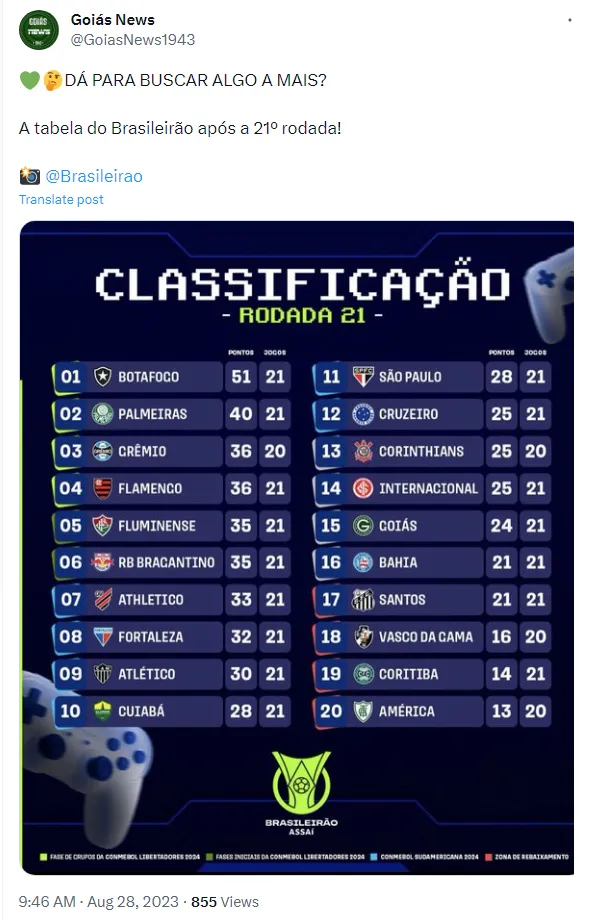 Vale lembrar que o vice-líder, Palmeiras, terá um jogo fora de casa no Derby, contra o Corinthians.
