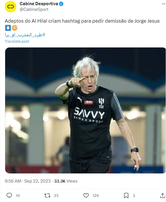 Dessa forma, no último jogo da equipe, que foi contra o Dhamk, pelo campeonato saudita, não saiu do empate por 1 a 1, e com isso, alguns torcedores do Al-Hilal subiram a hashtag pedindo a demissão de Jorge Jesus, como informa o ‘Cabine Desportiva‘.