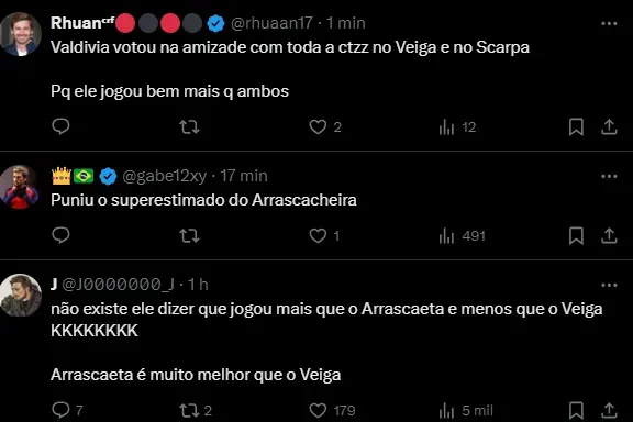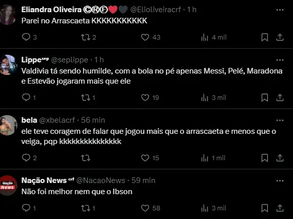 No mesmo vídeo, Valdivia também foi perguntado sobre outros a comparação com outros atletas, incluindo estrangeiros, convocados às seleções e campeões pelo Palmeiras, onde é ídolo.