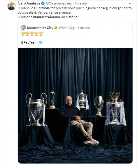 Flavio Prado, outro comentarista renomado, ressaltou a transformação impressionante que Guardiola realizou no clube inglês: “O City não era nem o melhor time de Manchester, e virou o melhor time do mundo”, observou Prado. “O Guardiola está entre os três maiores de todos os tempos”, afirmou.