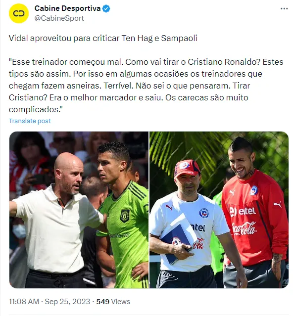 Em uma transmissão ao vivo na plataforma Twitch, Vidal abordou diversos assuntos, incluindo a saída de Cristiano Ronaldo do Manchester United. Ele deu a entender que não entendia por que o técnico Erik Ten Hag havia deixado o português de fora da equipe. Além disso, Vidal aproveitou a oportunidade para criticar Jorge Sampaoli, fazendo comentários sobre “carecas serem complicados”.