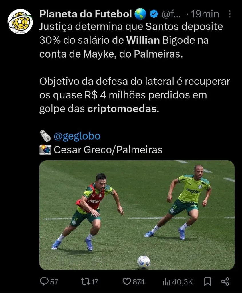 O lateral-direito Mayke e o meio-campista Gustavo Scarpa jogaram juntos com Willian ‘Bigode’ no Palmeiras. Foi nesse período que o atacante conseguiu convencer os companheiros de investirem em criptomoedas.
