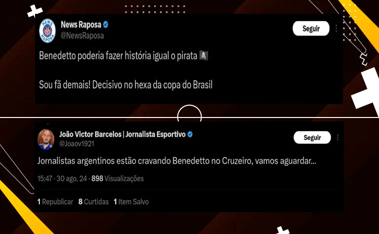 Entretanto, a fonte destacou que a possibilidade acabou sendo descartada pelas equipes. Nas últimas horas, inclusive, Benedetto foi ligado também ao Cruzeiro, que passa por problemas no setor do ataque.