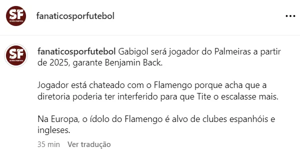 “Abel morre de amores pelo Gabigol, pediu a contratação e o atacante acertou com o Palmeiras. Ele está chateado com o Flamengo porque acha que a diretoria poderia interferir nas ideias de Tite, para que ele o escalasse mais. E a diretoria não faz isso. Gabriel tem mágoa com o Flamengo”, disse Benjamin Back, ao vivo.