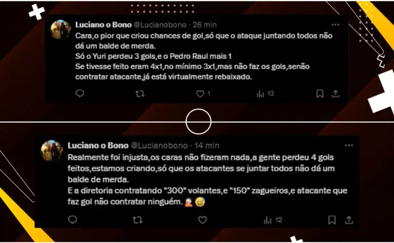 Outro Fiel torcedor, através da rede social X, ressaltou que o goleiro Hugo foi para a área de ataque nos últimos minutos de jogo, reforçando a falta de qualidade no ataque do Timão.
