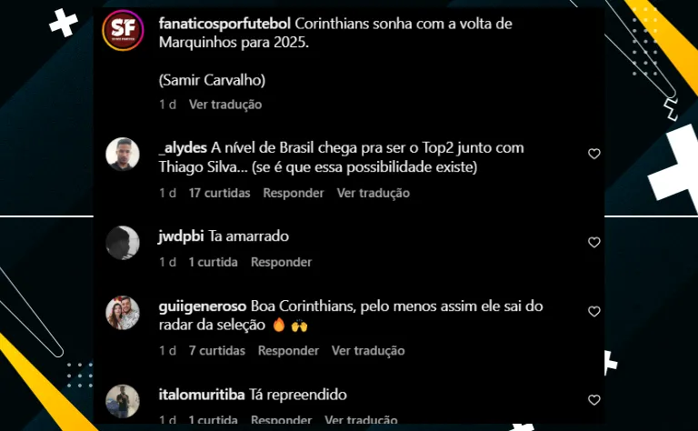 Por sua vez, o mesmo jornalista não revelou, de fato, quais seriam os jogadores que o Timão está planejando contratar para a janela do futebol brasileiro de 2025, apesar dos rumores pelos lados de Itaquera