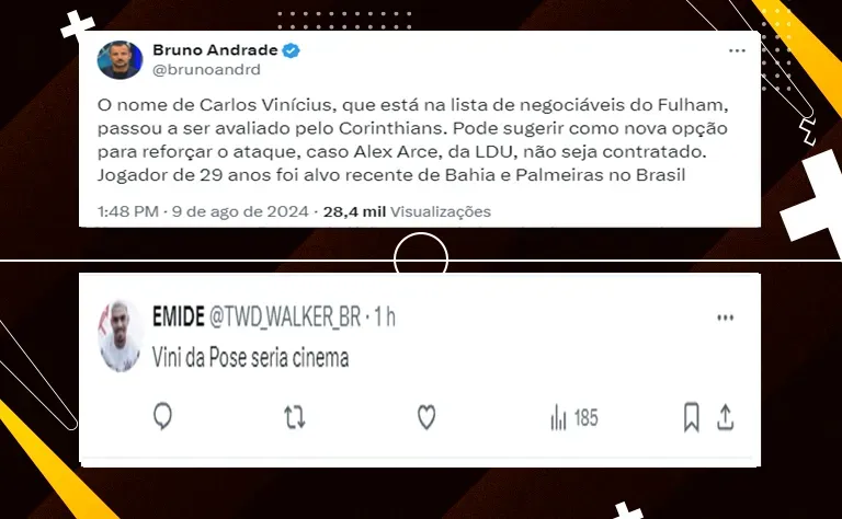 O jornalista Bruno Andrade conta que o Corinthians avalia o nome do jogador, que está disposto a voltar ao Brasil. Carlos Vinícius pertence ao Fulham, mas o clube londrino não deve dificultar uma saída.