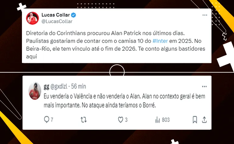 Assim, Augusto Melo segue mapeando o mercado. Um dos alvos do momento, é o meia Alan Patrick, do Internacional. A informação foi publicada pelo jornalista Lucas Collar.
