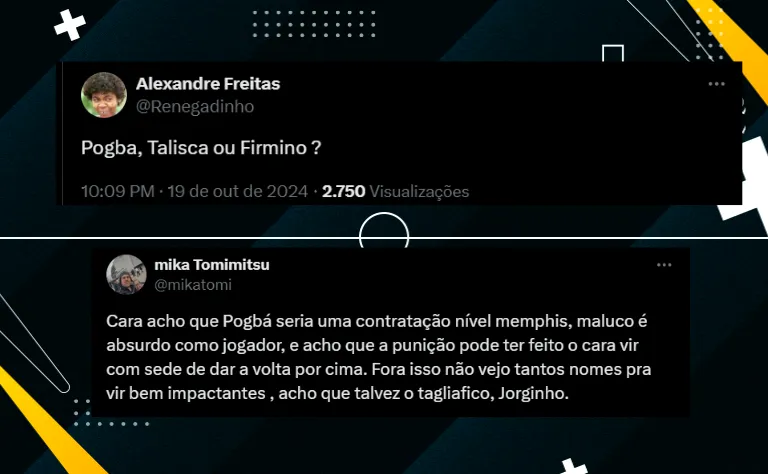 O nome de Pogba surge no clube paulista em meio à saída da Juventus: tanto o clube quanto o jogador não querem continuar a parceria em 2025. Assim, a Fiel sonha com o negócio, embora seja difícil. O nome de Talisca também foi citado.