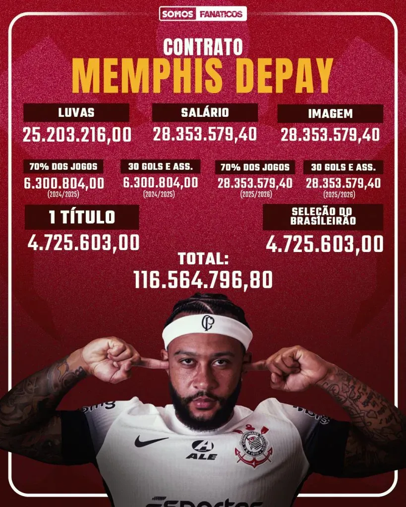No total, o acordo do Alvinegro Paulista com Depay pode render aproximadamente R$ 120 milhões ao jogador. Deste valor, a patrocinadora máster arca com menos da metade: R$ 57 milhões.