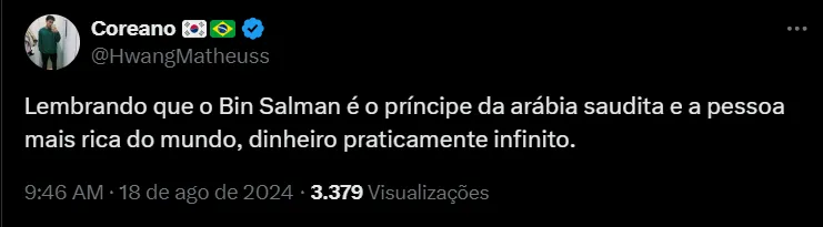 O bilionário Mohammad bin Salman, principal líder de um fundo saudita e um dos donos do Newcastle United, da Inglaterra, estaria em negociações para fazer parte de um grande clube do futebol brasileiro.