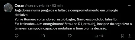Além disso, jogadores considerados titulares e peças importantes no elenco do Corinthians, como Rodrigo Garro e Yuri Alberto, foram grandes alvos da torcida.