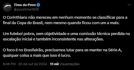 Dentre as maiores críticas dos fanáticos, a falta de criatividade da equipe corinthiana foi o que mais incomodou os torcedores que viram o Corinthians dar adeus à Copa Betano do Brasil.