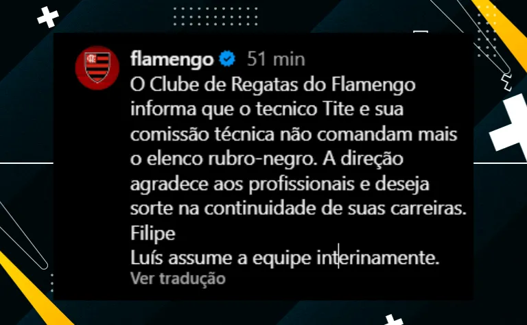 “O Clube de Regatas do Flamengo informa que o técnico Tite e sua comissão técnica não comandam mais o elenco rubro-negro. A direção agradece aos profissionais e deseja sorte na continuidade de suas carreiras”, diz a nota oficial.