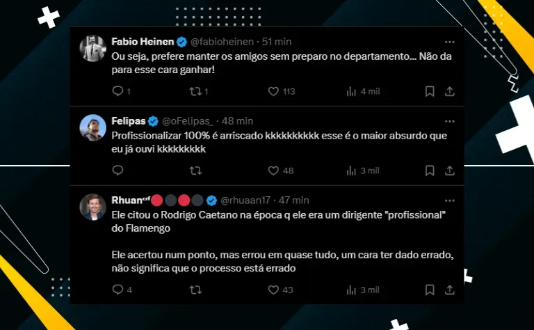 “Pela experiência que eu tenho no passado, você profissionalizar 100% o departamento de futebol é arriscado também. Você dar poder demais a um diretor de futebol como foi o Rodrigo Caetano não é legal”, disse.