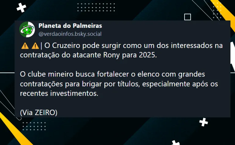 Segundo o portal Zeiro, a Raposa busca seguir fortalecendo o elenco após as contratações no mercado de inverno do Brasil e surge como uma dos possíveis destinos do ídolo do Verdão em 2025. Não há ofertas e nem contatos.