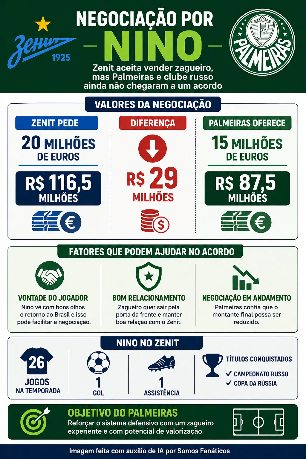 A novela da possível chegada do zagueiro Nino ao Palmeiras tem mais um capítulo. Segundo revela Bruno Andrade, da ESPN, o Zenit aceita vender seu defensor, mas a diferença do que o clube pede e o que o Verdão sinaliza pagar é de R$ 29 milhões.