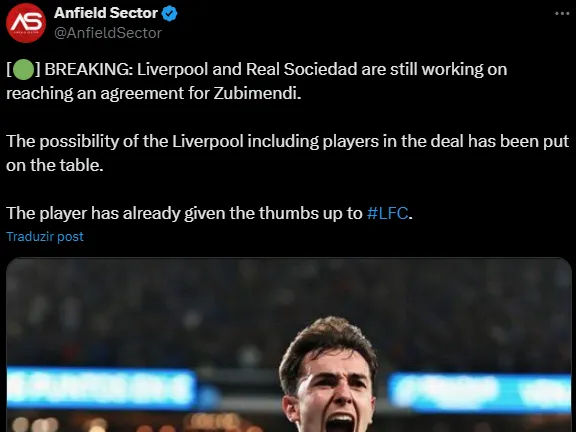 De acordo com informações publicadas pelo perfil Anfield Sector (@AnfieldSector), Zubimendi deu OK para o Liverpool avançar junto à Real Sociedad.