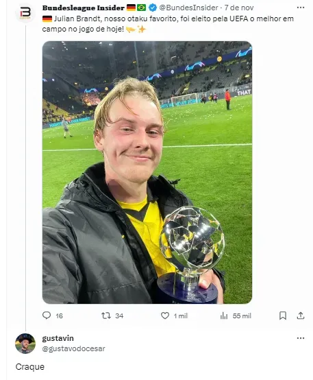 Se trata do meia-atacante alemão Julian Brandt, que defende as cores do Borussia Dortmund. O técnico do Newcastle, Eddie Howe por exemplo, o viu de perto em dois jogos pela Liga dos Campeões.