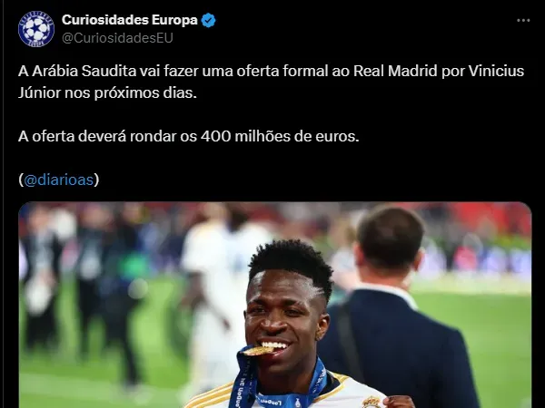 Horas antes da decisão da Supercopa da UEFA, o presidente do clube merengue, Florentino Pérez, ordenou ao CEO José Ángel Sánchez que informasse para o Al-Ahli, da Arábia Saudita, o valor que envolve Vini Jr.