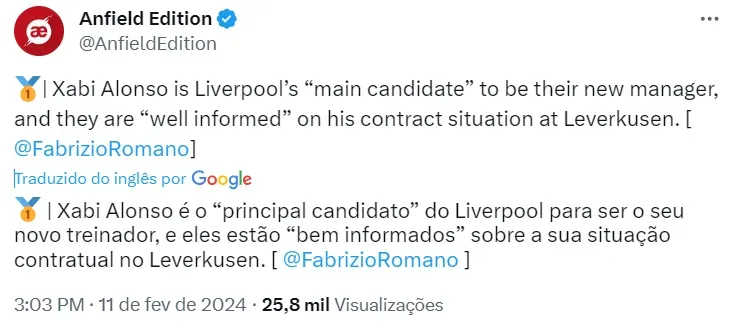 De acordo com a fonte, os Reds fazem de Alonso o principal candidato para substituir Klopp na próxima temporada do futebol europeu. Inclusive, o Liverpool está bem informado sobre o contrato de Alonso na Alemanha.