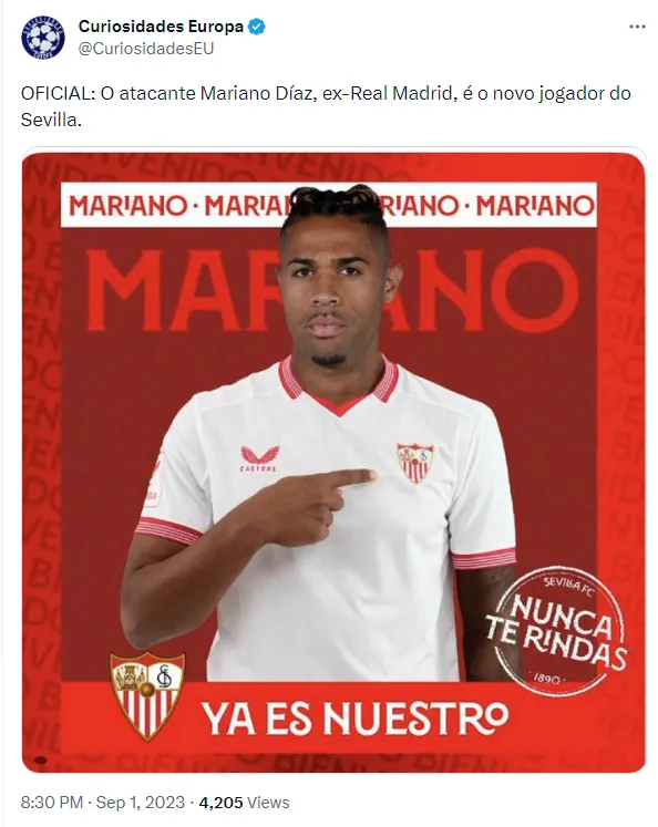 Entretanto, o ex-Real Madrid acertou com o Sevilla, da Espanha, em um contrato que irá até 2025.