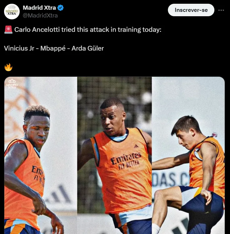 O último treino foi de grata surpresa para o torcedor e, sobretudo, para a imprensa: o turco Guler foi testado ao lado de Mbappé e Vinicius Jr e ganhou a vaga de Rodrygo. Ancelotti deu pistas do que pode ser o time titular do Real Madrid para o importante duelo que vale título contra os italianos.