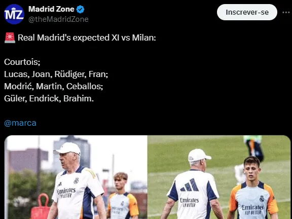 A primeira partida da equipe espanhola na temporada será nesta quarta-feira (31). Diante do Rossonero, Ancelotti deve escalar Endrick como titular ao lado de Arda Güller e Brahim Díaz.