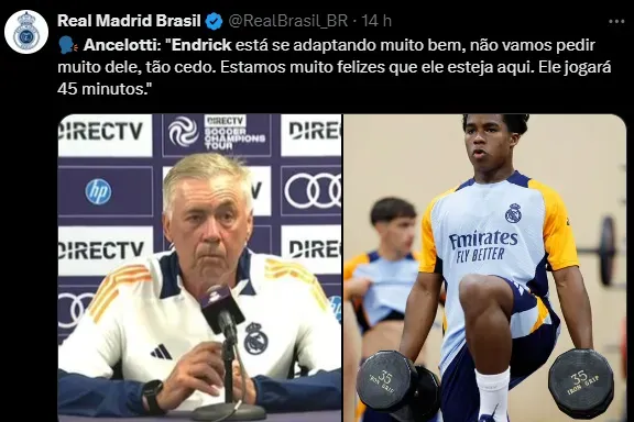“Endrick está se adaptando muito bem, não vamos pedir muito dele, tão cedo. Estamos muito felizes que ele esteja aqui. Ele jogará 45 minutos”, comentou Carlo Ancelotti.