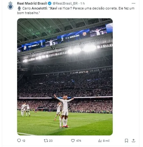 O treinador do Real Madrid considera que Xavi fez um ótimo trabalho e entende bem o funcionamento do Barcelona: “Penso que Xavi fez um grande trabalho no Barcelona e conhece muito bem o clube. Creio que é a decisão correta”, disse.