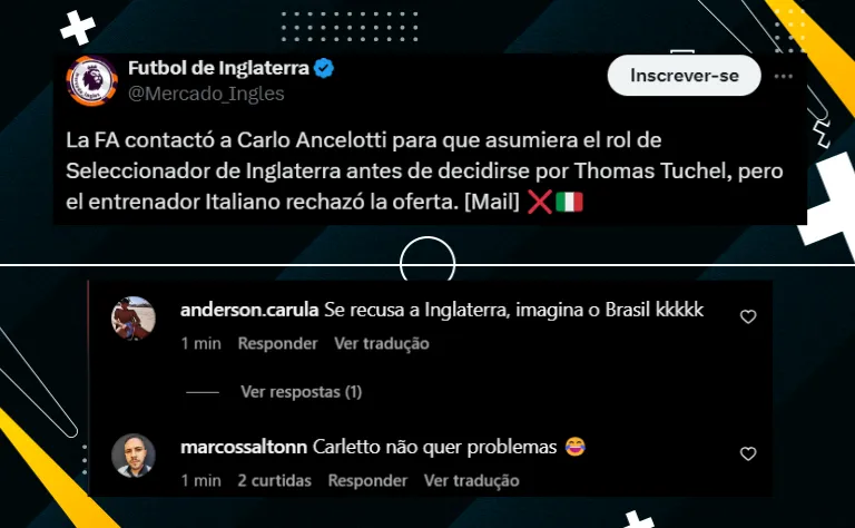 A busca da Inglaterra aconteceu antes do acerto com Thomas Tuchel. Ancelotti era visto como o treinador ideal para o projeto, visto que conhece bem o futebol inglês. No entanto, ele optou por ser leal ao Real Madrid.