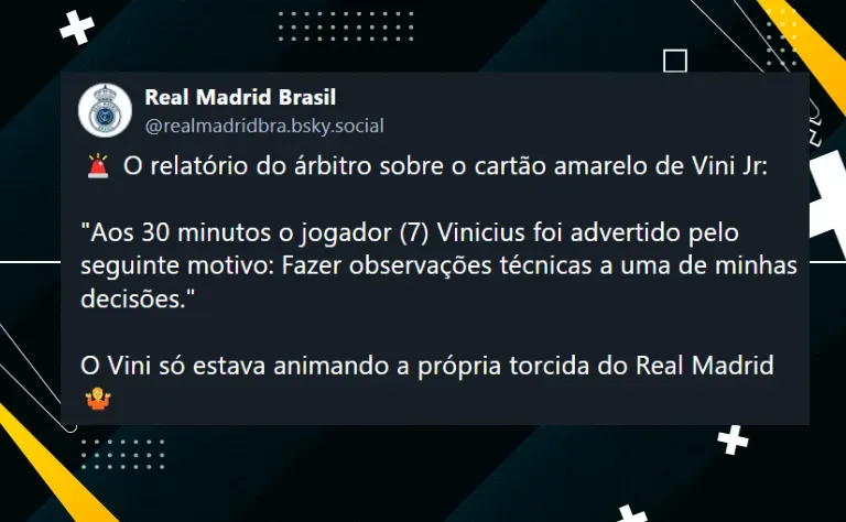 Na súmula, Vinicius foi advertido por fazer “observações técnicas” para uma decisão do árbitro responsável pelo jogo. Nas redes socias, torcedores alegam que o brasileiro estava apenas animando a torcida presente no estádio.
