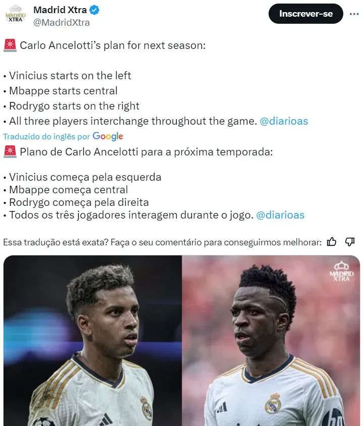 De acordo com o Diário AS, o plano de Ancelotti é jogar em um 4-3-3, com Vini Jr, Mbappé e Rodrygo na frente. Havia o temor de que a revelação do Santos perderia espaço, mas isso não deverá acontecer.