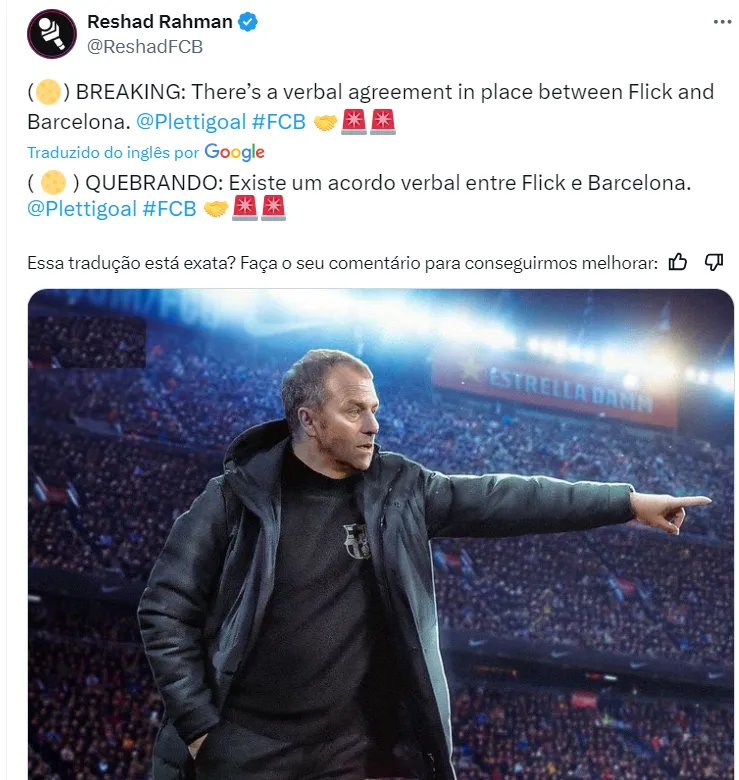 O alemão Hansi Flick está apalavrado para ser o treinador do Barcelona na próxima temporada, segundo informações de Florian Plettenberg, repórter da Sky Sports. O comandante, livre, chegará ao clube espanhol sem complicações.