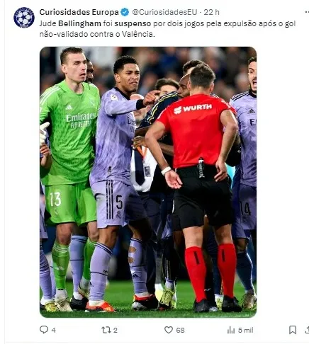 A polêmica ocorreu durante o jogo contra o Valencia, quando Bellingham foi expulso após reclamar com o árbitro por encerrar a partida enquanto uma bola estava em jogo. O meio-campista cabeceou e marcou um gol, mas o árbitro já havia apitado o fim da partida e não validou o gol do Real Madrid.
