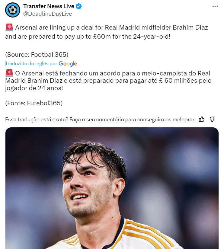O Arsenal confia na possível vontade de Brahim de jogar na Premier League para ter sucesso nas futuras negociações com o Real Madrid. Isso porque, segundo a fonte, Brahim estaria disposto a jogar com Arteta.