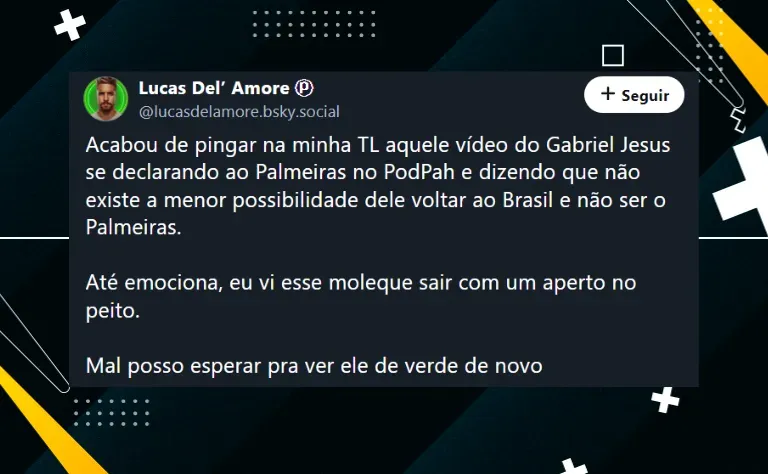 De acordo com Henrique Toth, do site Vamo Palmeiras, Gabriel Jesus é prestigiado na Inglaterra e está nos planos do técnico Arteta. Por isso, qualquer chance de negócio, neste momento, está descartado.